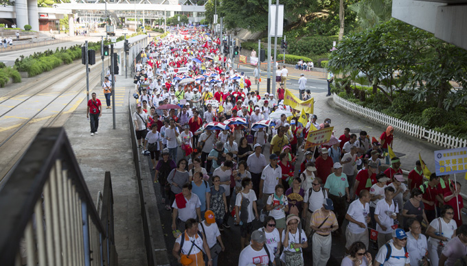 8月17日下午,在超過32度高溫的天氣情況下,集團(tuán)領(lǐng)導(dǎo)和在港各部司員工及部分員工家屬800余人,積極響應(yīng)香港中國企業(yè)協(xié)會的呼吁,參加了香港「保普選、反占中」大聯(lián)盟發(fā)起的「和平普選大游行」,表達(dá)港中旅員工擁護(hù)「一國兩制」和基本法、依法實(shí)施普選的愿望和訴求。張學(xué)武董事長和姜巖董事副總經(jīng)理到維園集會現(xiàn)場為大家加油鼓勁,張逢春總會計師、許慕韓副總經(jīng)理等集團(tuán)領(lǐng)導(dǎo)和員工隊(duì)伍一起全程參加了游行。