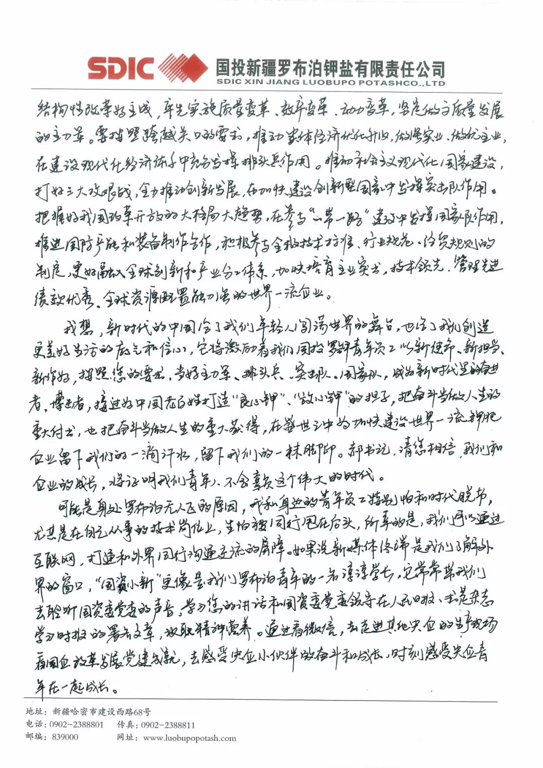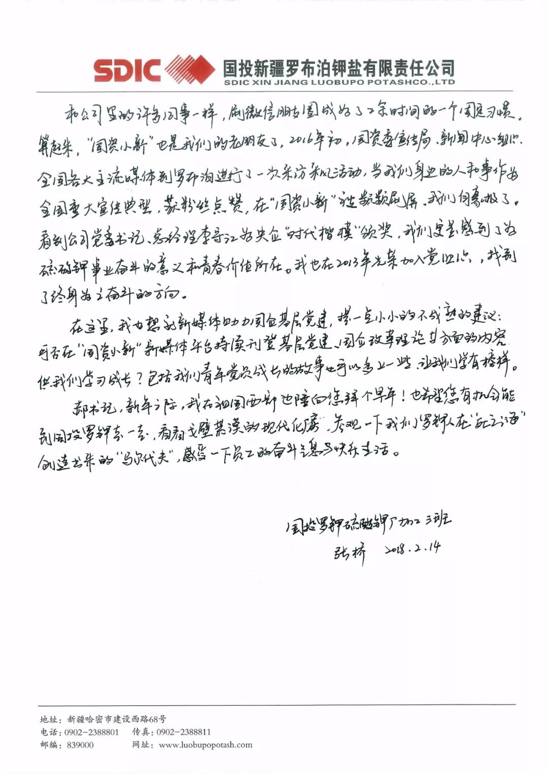 這封寫(xiě)給郝鵬書(shū)記的信,來(lái)自國(guó)投新疆羅布泊鉀鹽有限責(zé)任公司硫酸鉀廠加工車間加工三班的一位普通青年員工。