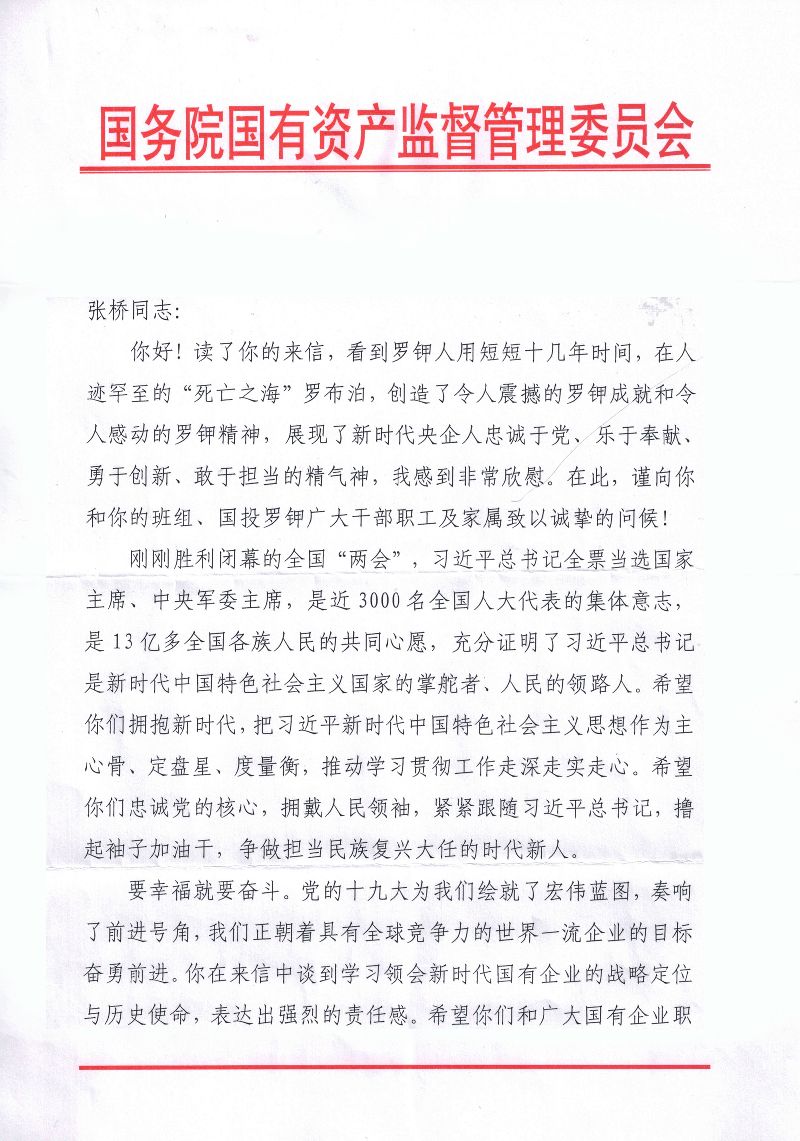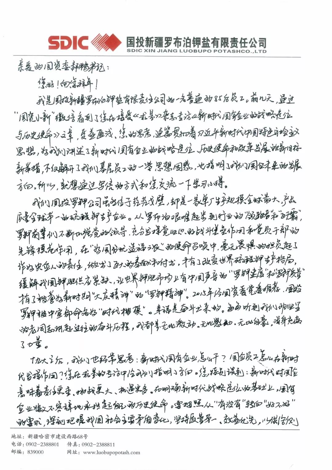 我是國(guó)投新疆羅布泊鉀鹽有限責(zé)任公司的一名普通的85后員工。前幾天,通過(guò)“國(guó)資小新”微信看到了您在接受《求是》雜志專訪的《新時(shí)代國(guó)有企業(yè)的戰(zhàn)略定位與歷史使命》文章,受益匪淺。您的思考,通篇貫徹著習(xí)近平新時(shí)代中國(guó)特色社會(huì)主義思想,為我們講述了新時(shí)代國(guó)有企業(yè)的戰(zhàn)略定位、歷史使命和改革發(fā)展的新目標(biāo)新舉措,不僅解開(kāi)了我們基層員工的一些思想困惑,也指明了我們國(guó)企未來(lái)的發(fā)展方向。所以,就想通過(guò)寫(xiě)信的方式和您交流一下學(xué)習(xí)心得。